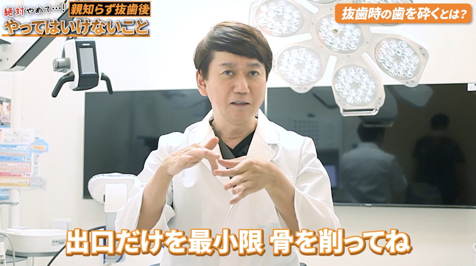 ひどい場合は5分割・6分割することもあるそうです。患者さんにとっては「何を削ってるんだろう…」という不安感があるかもしれないけれど、それは術後の痛みと腫れをできるだけ抑えるためのテクニックなのだと先生は説明しています。